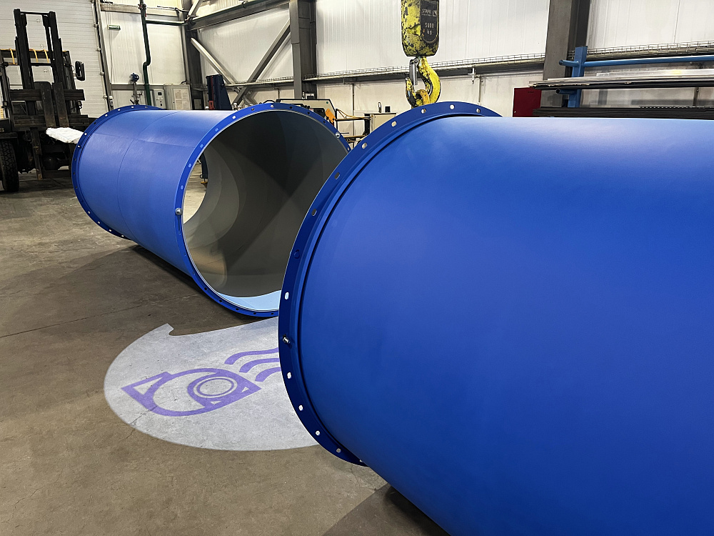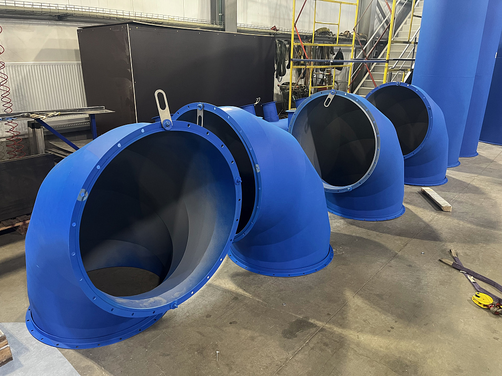 Нашей компанией были изготовлены воздуховоды, дроссель-клапана и сопла из ст3 толщиной 1,5-2,0 мм для системы подачи воздуха от вентилятора производительностью 50 000 м3/ч на обдув подпятовой балки, влетов горелок и торцевых стен регенераторов стекловаренной печи.